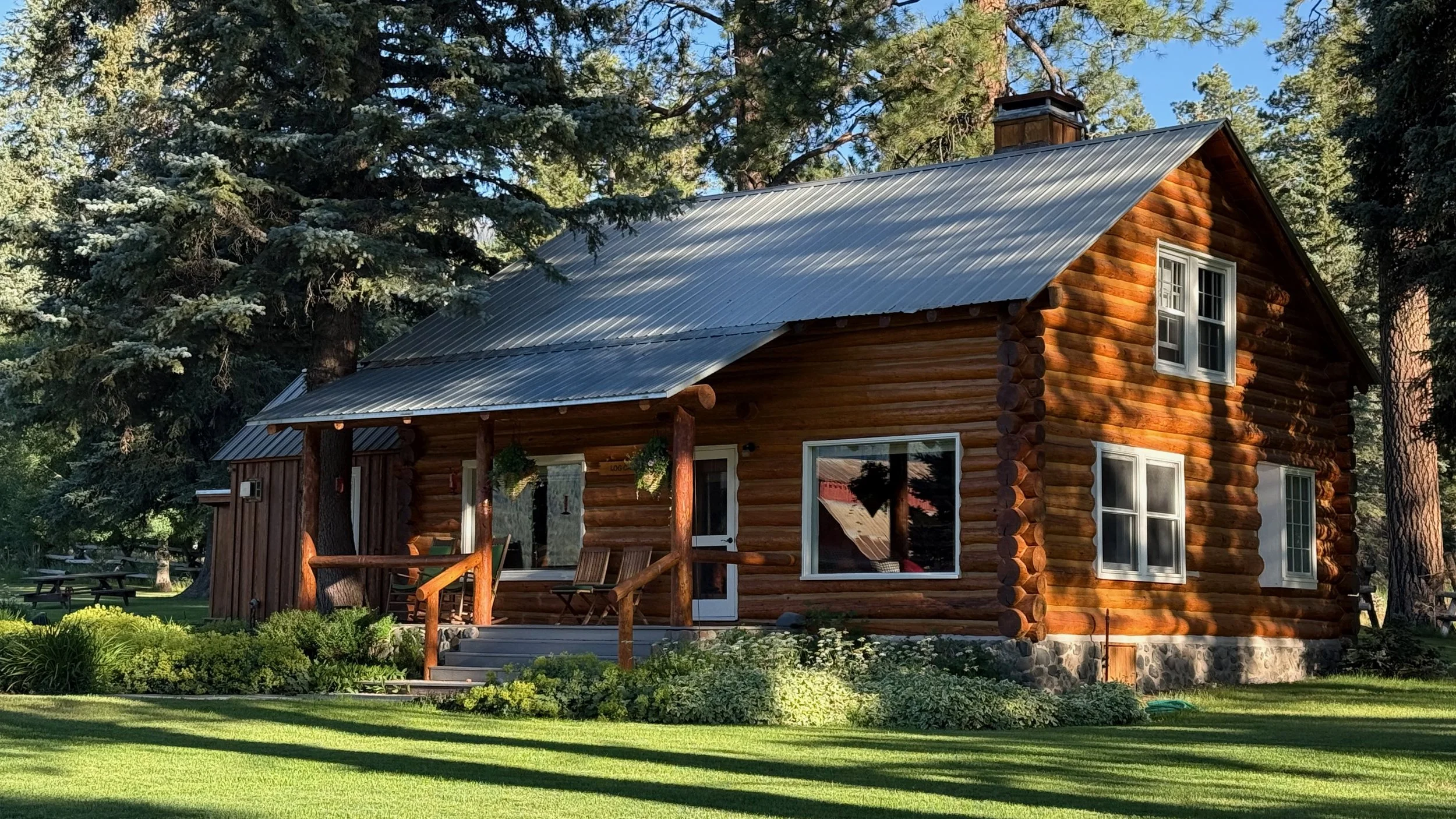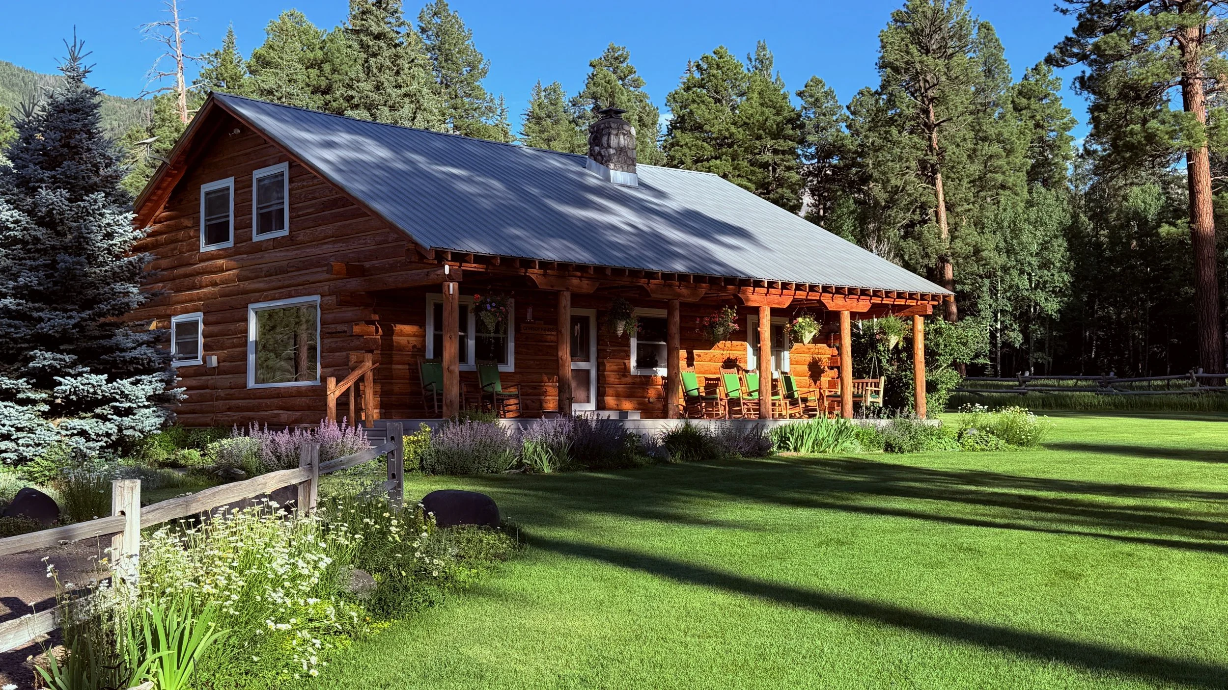 A classic El Rancho Pinoso cabin with modern updates and timeless ranch charm, restored logs, a river-rock fireplace, and front-porch views. Sleeps up to 10.
